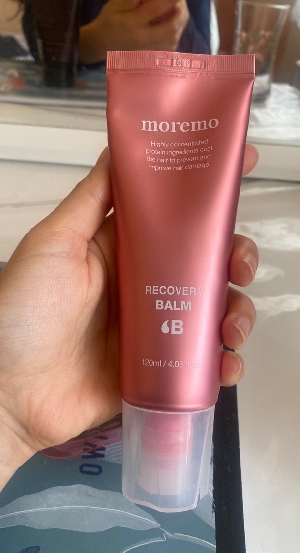 Moremo Recovery Balm, parlak pembe ambalajda, saçı kaplayan ve hasarı önleyip iyileştiren yoğun protein içerir. 120ml tüp şeklindedir. Parmağımla gösterdiğim yere kadar doludur
