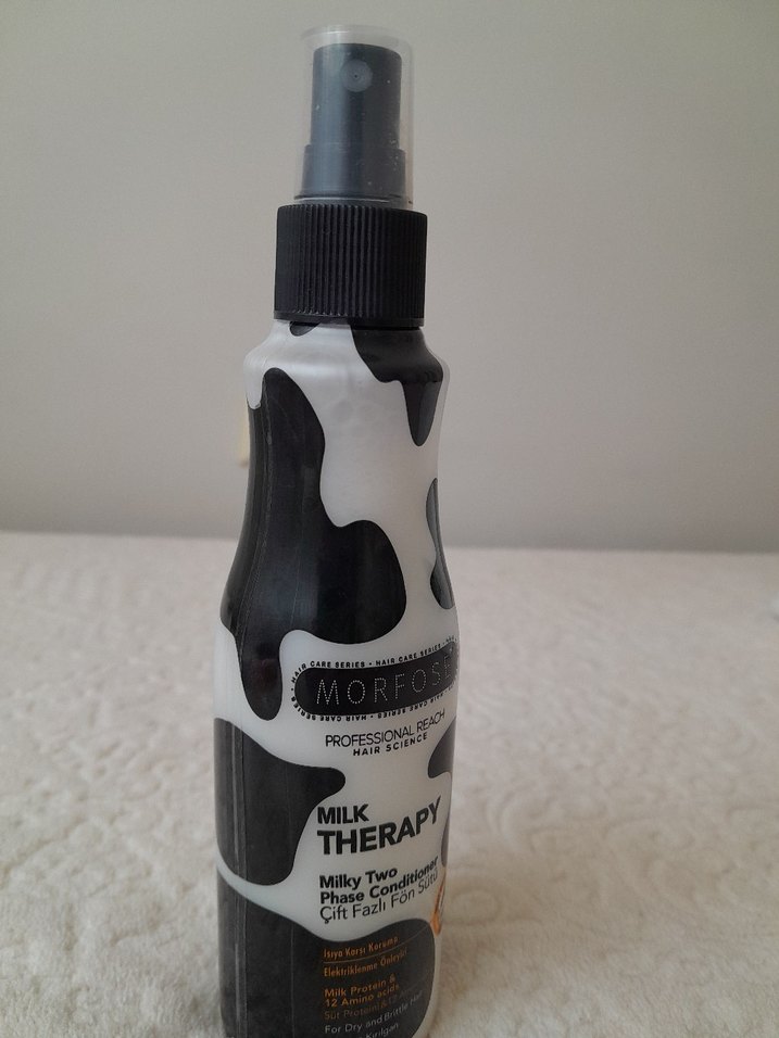 Morfo Milk Therapy, saçları besleyen ve koruyan çift fazlı bir saç spreyi. Siyah beyaz renklerde, pompalı sprey şişesinde sunulur.