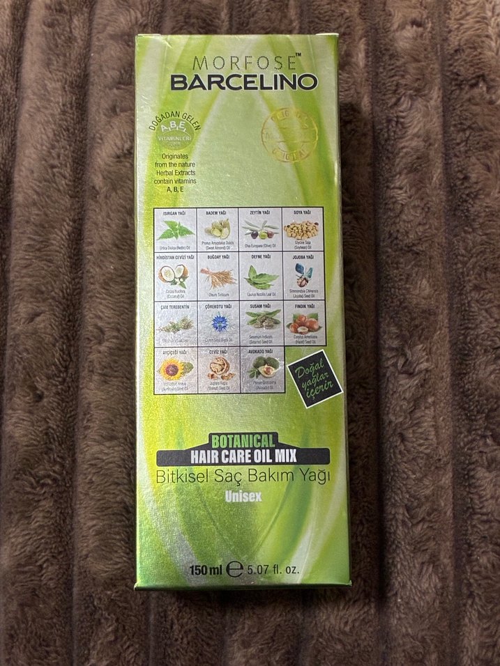 Morfose Barcelino Bitkisel Saç Bakım Yağı, doğal bitki özleri ve A, B, E vitaminleri içerir. Saç sağlığını destekler ve besler.