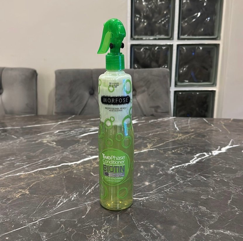 Morfose iki fazlı biotinli saç kremi, ferahlatıcı formülü ve pratik sprey başlığı ile saç bakımında kolaylık sağlar.