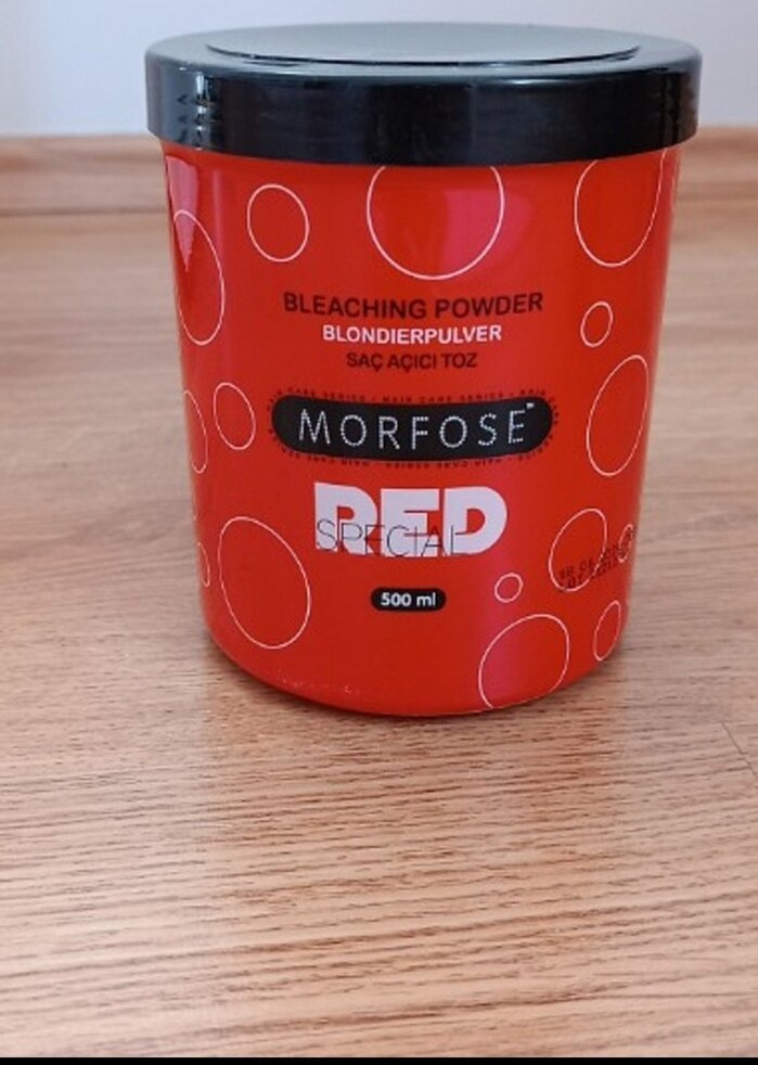 Morfose kırmızı saç açıcı toz, 500 ml hacminde, etkili saç açma sağlar. Siyah kapaklı kırmızı kutuda sunulur. Saç boyama işlemleri için uygundur. ilan açtırınız lütfen satın almadan önce