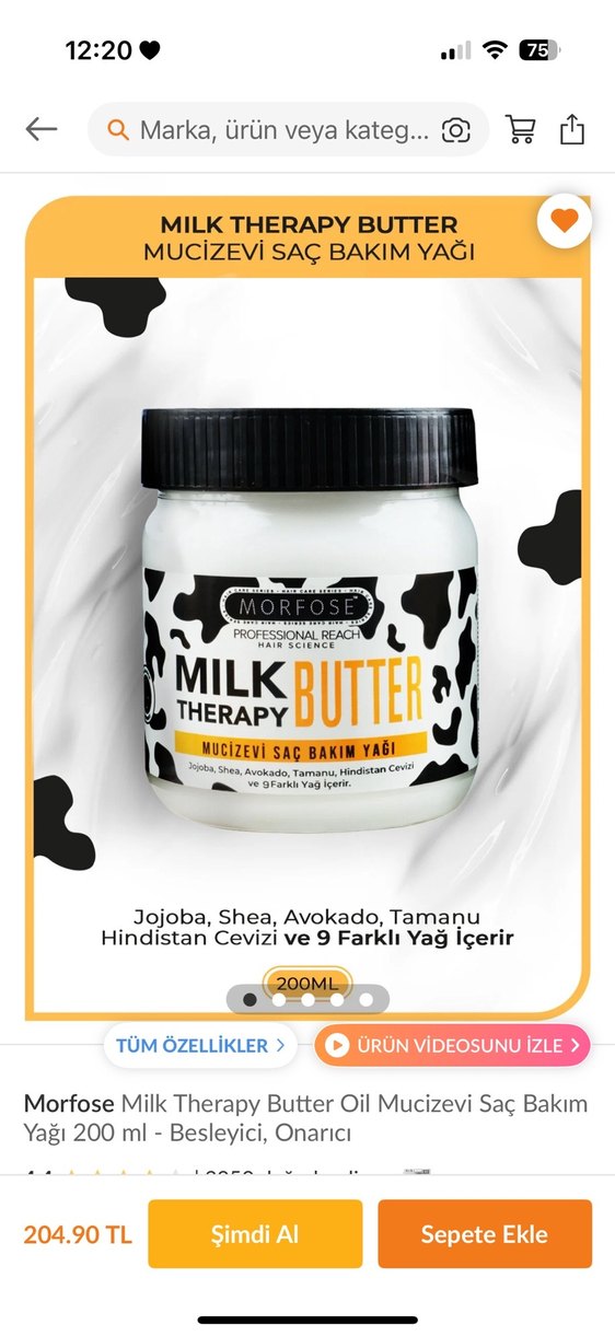 Morfose Milk Therapy Butter saç bakım yağı; jojoba, shea, avokado, tamanu, hindistan cevizi ve 9 farklı yağ içerir, saçları derinlemesine besler.