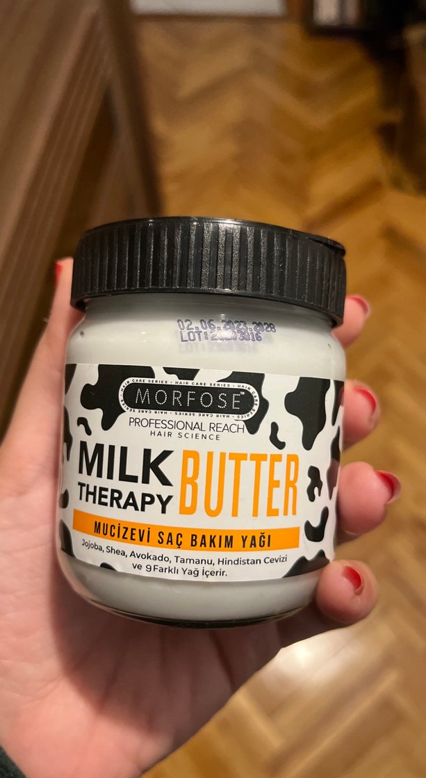 Morfose Milk Therapy Butter, jojoba, shea, avokado, tamanu, hindistancevizi ve 9 farklı yağ içerir. Saç için besleyici bakım yağıdır.