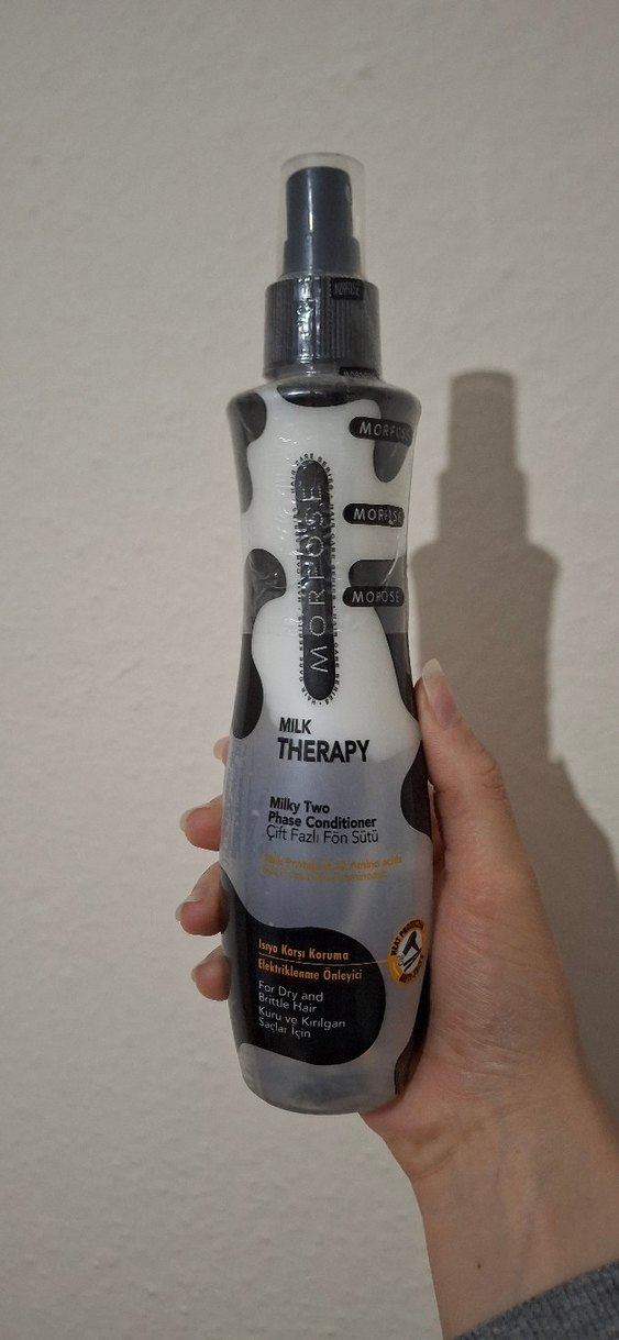 Etiketlidir. Morfose Milk Therapy Milky Two Çift Fazlı Saç Kremi, kuru ve kırılgan saçları ısı ve elektriklenmeye karşı korur, saçları yumuşatır ve güçlendirir.