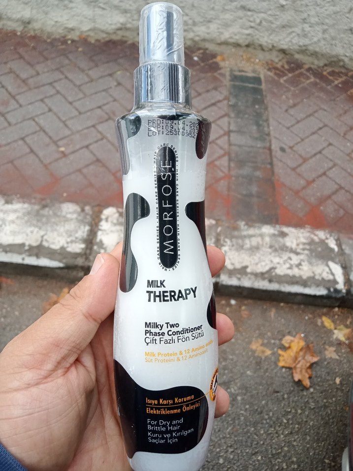 Morfose Milk Therapy, kuru ve kıvırcık saçlar için süt proteinleri ve 12 aminoasit içeren çift fazlı bir saç kremidir. Elektriklenmeyi önler ve besler.