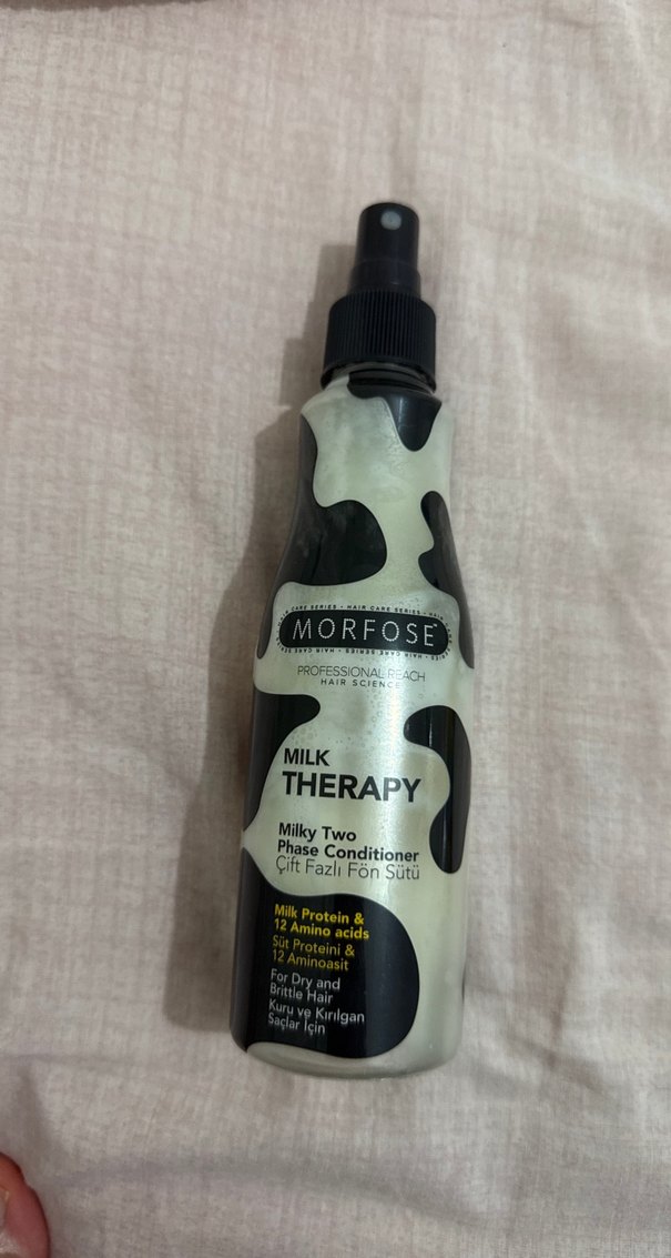 Morfose Milk Therapy Çift Fazlı Saç Sütü, süt proteini ve 12 aminoasit içerir. Kuru ve kırılgan saçlar için besleyici ve bakım sağlar Yarıya kadar dolu.