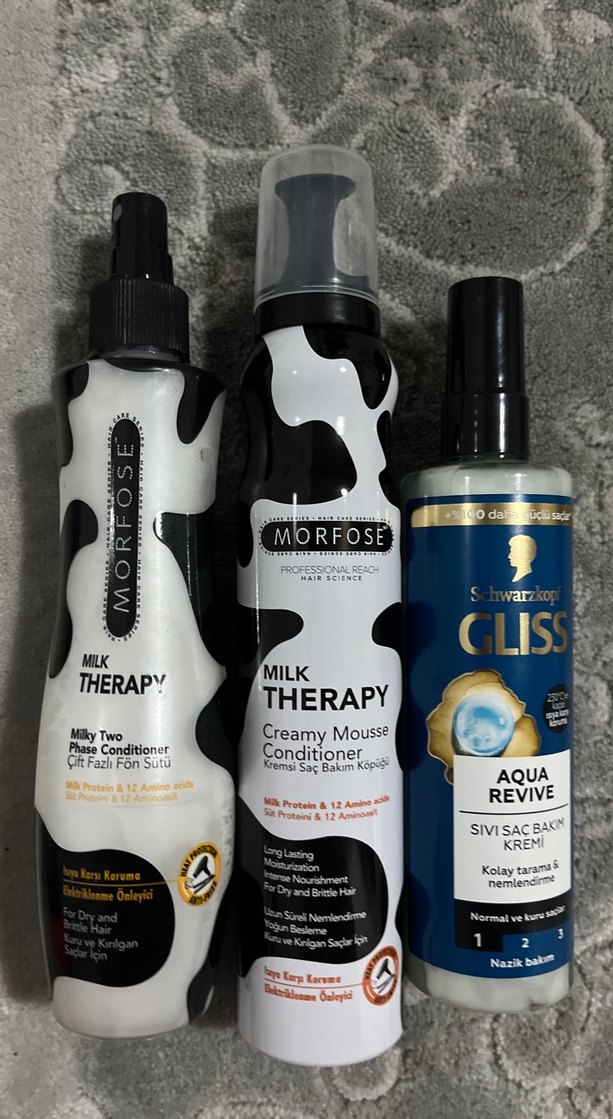 Morfose Milk Therapy, iki fazlı sprey ve krem köpük saç bakım ürünleriyle uzun süreli nem ve bakım sağlar. Schwarzkopf Gliss Aqua Revive spreyi kolay tarama ve nemlendirme sunar. ♀️ en soldakinin kapagi kayip tekli fiyati