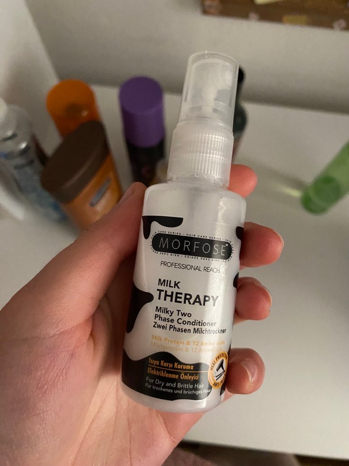 Morfose Milk Therapy iki fazlı saç bakım spreyi, süt proteini ve 12 vitamin içerir. Kuru ve kırılgan saçlar için koruma ve besleme sağlar. Hiç kullanmadım.