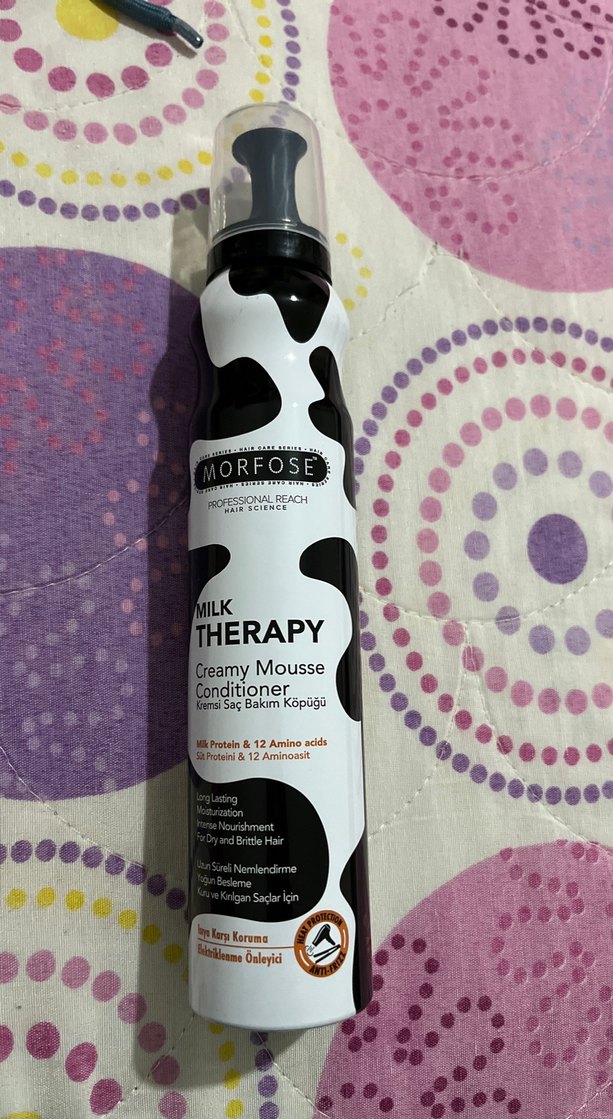 Morfose Milk Therapy krem köpük saç kremi, süt proteini ve 12 amino asit içerir. Kuru ve kırılgan saçları derinlemesine nemlendirir ve besler, saçı kırılmaya karşı korur. 1 sefer sadede kullanıldı.