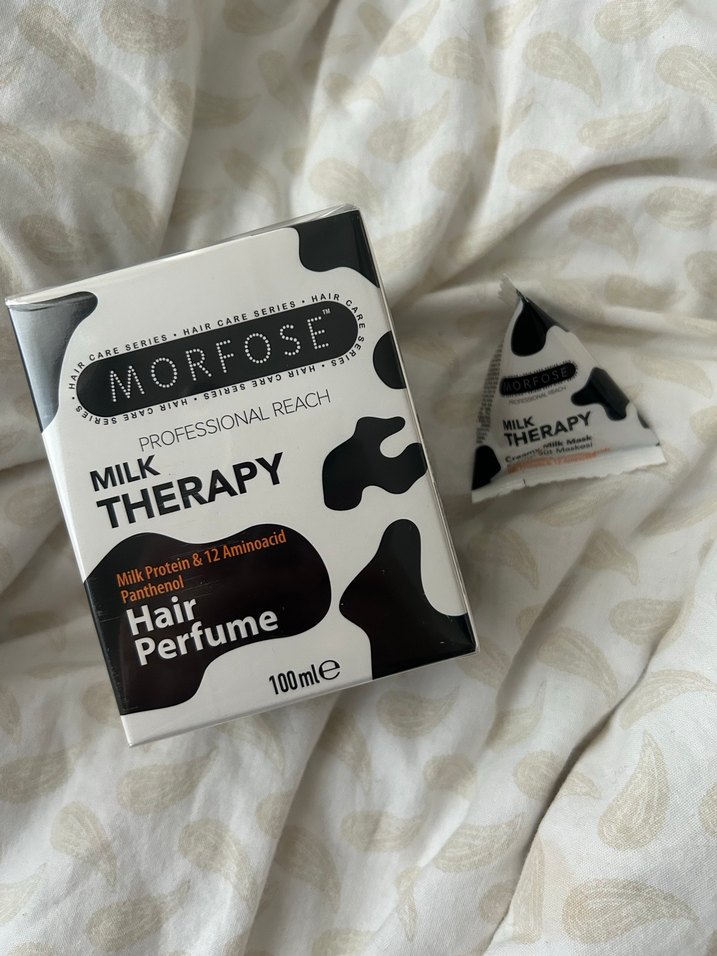 Morfose Milk Therapy saç parfümü,100 ml hiç açılmadı ambalajı üstünde. süt proteini, 12 aminoasit ve panthenol içerir. saçlarınızı besler ve hoş koku sağlar.