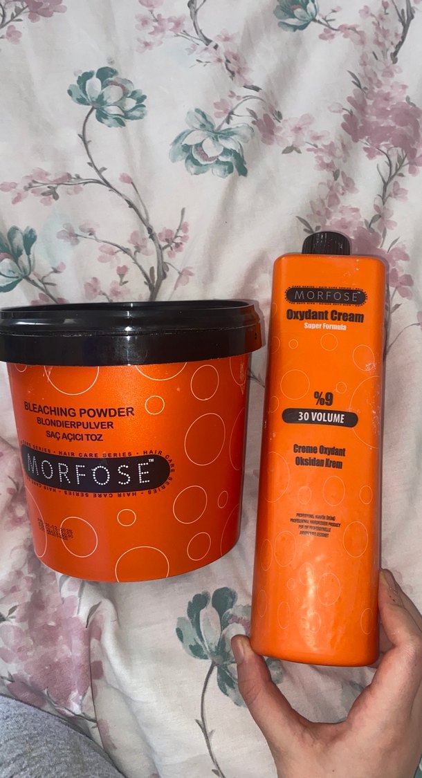 Morfose saç boyama ve açma işlemleri için %9 30 volümlük oksidan krem ve açıcı toz seti. İçinde açıcı toz ve oksidan krem bulunur.Bu yıl haziranda aldım eski rengimi döndüm o yüzden satıyorum ölçülerini elimle gösterdim