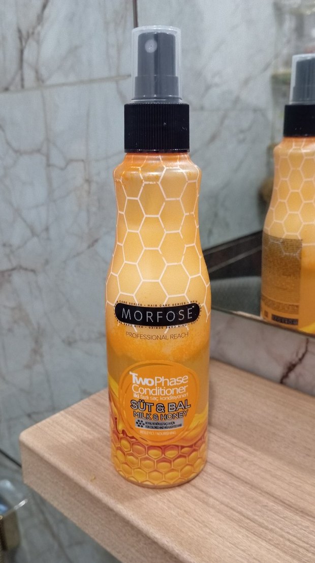 Morfose Süt ve Bal içeren iki fazlı saç kremi, saçı besleyip yumuşatır, kolay tarama ve ferah koku sağlar .İKİ KEZ KULLANDIM