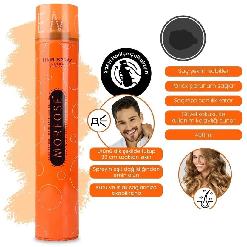 Morfose Ultra Strong Saç Spreyi, saç şeklinizi sabitler ve parlak görünüm sağlar. Saçınıza canlılık verir, hoş kokuludur. Kuru ve ıslak saçlarda kullanılabilir, kullanımı kolaydır.