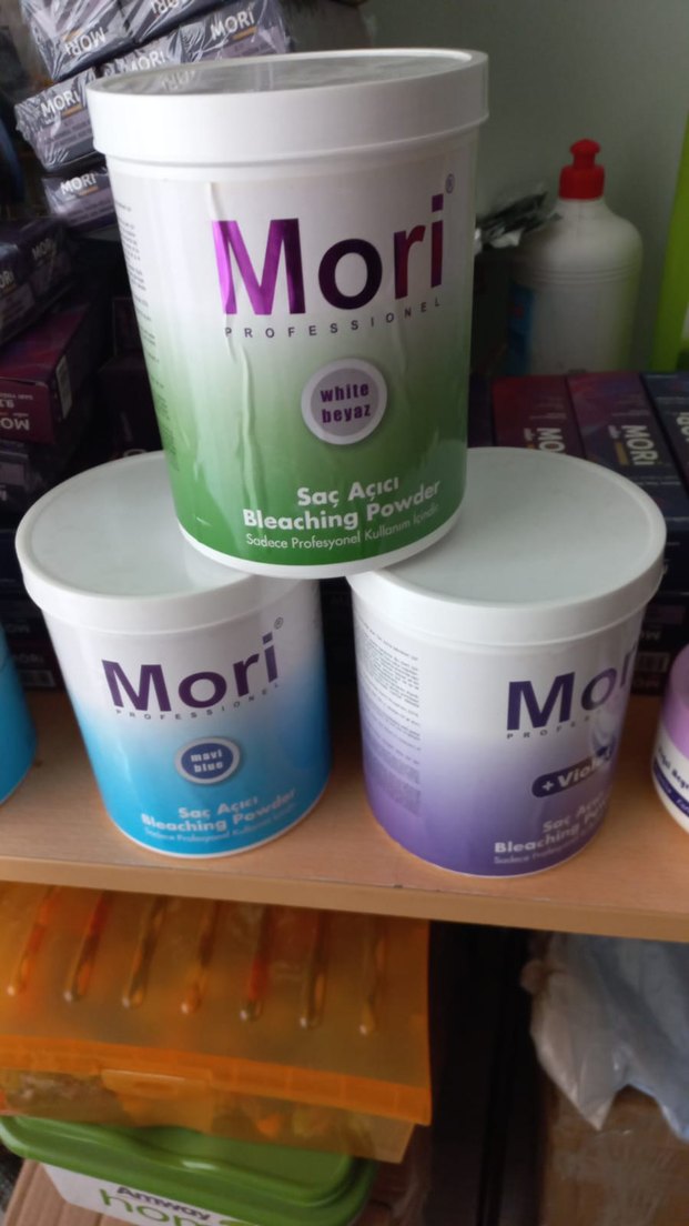 Mori profesyonel saç açıcı tozu, farklı formüllerde saç açmak için. Beyaz ve mor seçenekleri bulunur.