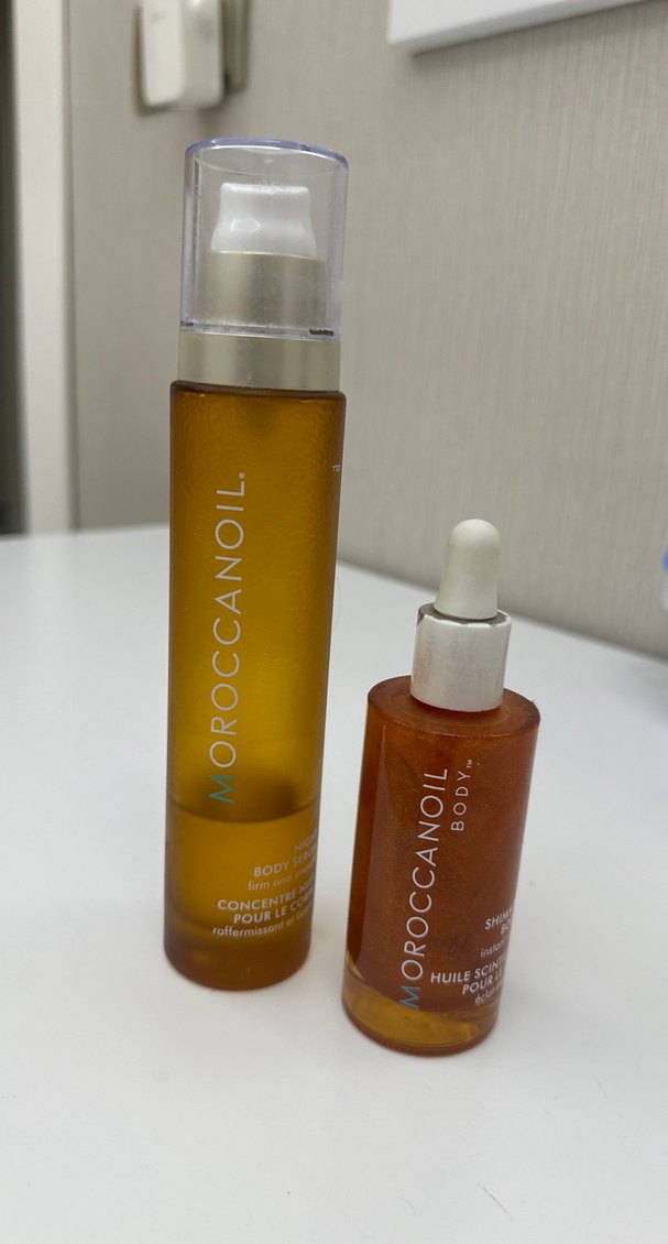 Moroccanoil vücut yağları, pompalı ve damlalıklı cam şişelerde sunulur. Cilde bakım ve parlaklık sağlar. Body serum göründüğü kadar diğer simli vucüt yağ ise sadece denendi . Kapağı durduğu yerde soyulmuş fakat ürün yepyenidir. İkisi birlikte fiyatıdır