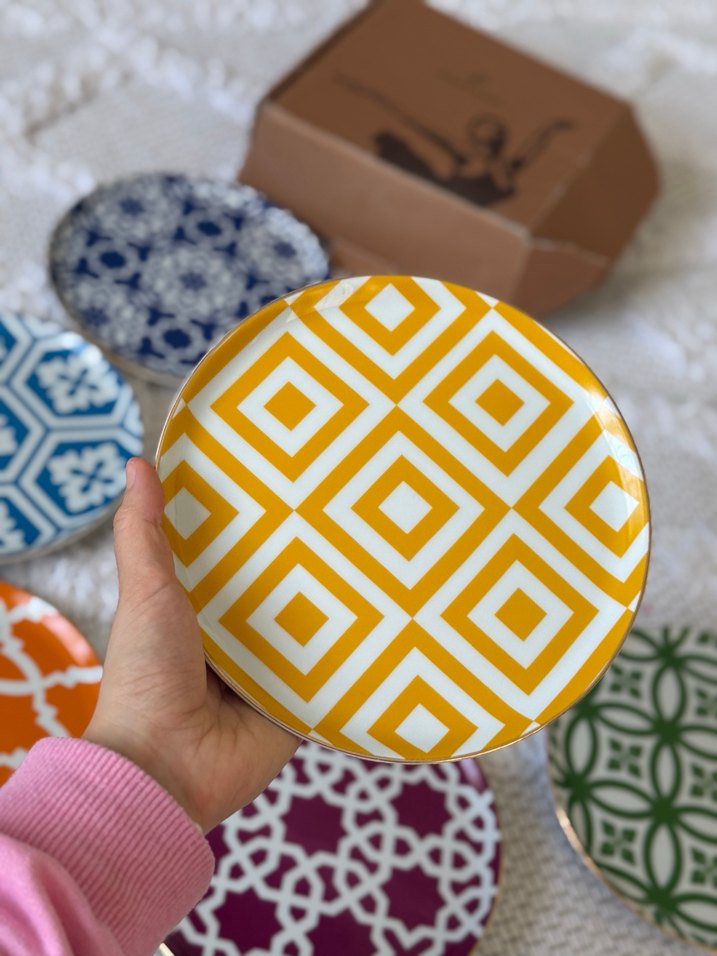 Yuvarlak, sarı geometrik desenli, Morocco serisi porland marka pasta tabağı . Çeşitli sunumlar icin uygundur.
