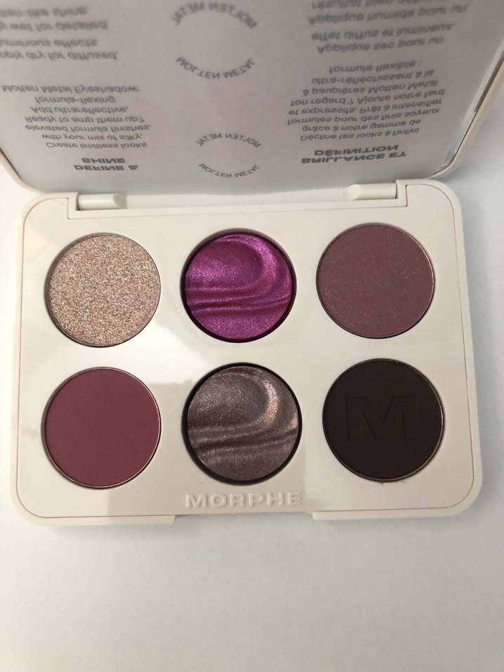 Morphe markalı, mat ve ışıltılı bitişlere sahip, koyu ve bej tonlarında 6 renkli göz farı paletidir.