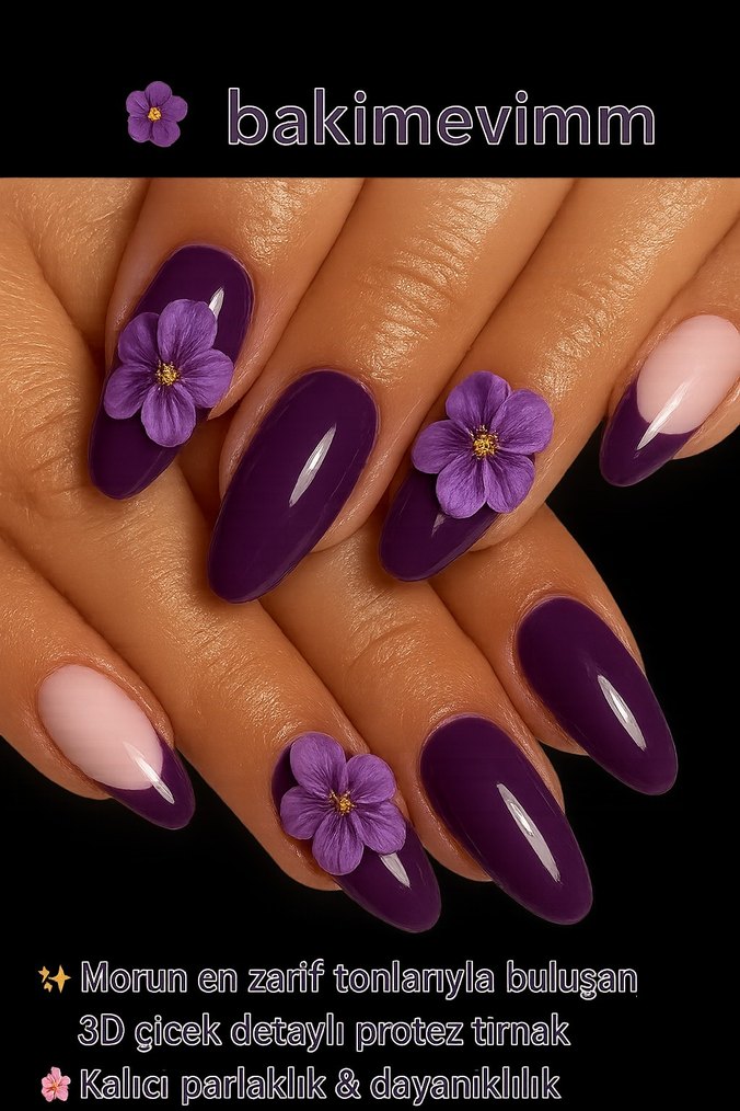 ✨ Morun en zarif tonlarıyla buluşan 3D çiçek detaylı protez tırnak Kalıcı parlaklık & dayanıklılık Özel günler için şık tercih Fiyat: 210 el yapımı ✨ kargo bedava 24 adettir.
