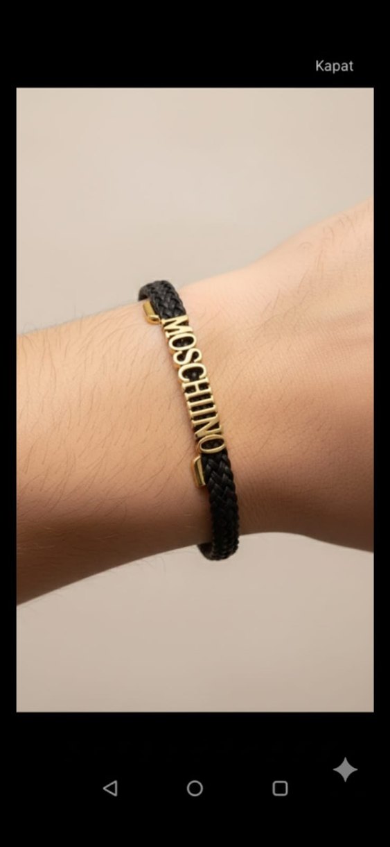 Parlak altın renk Moschino yazılı, siyah örgü bantlı erkek biker bileklik, vintage tarzıyla dikkat çekiyor. ️