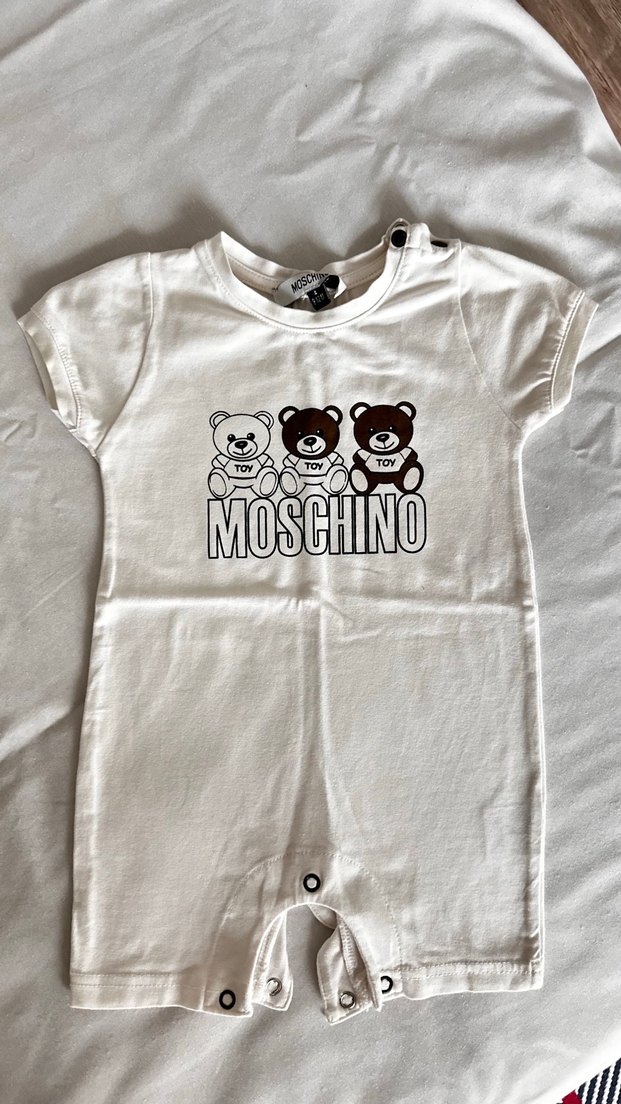 Moschino beyaz erkek bebek tulumu, kısa kollu, yuvarlak yaka ve ayıcık baskılıdır. Yumuşak pamuktan üretilmiş, rahat ve sokak stilinde.