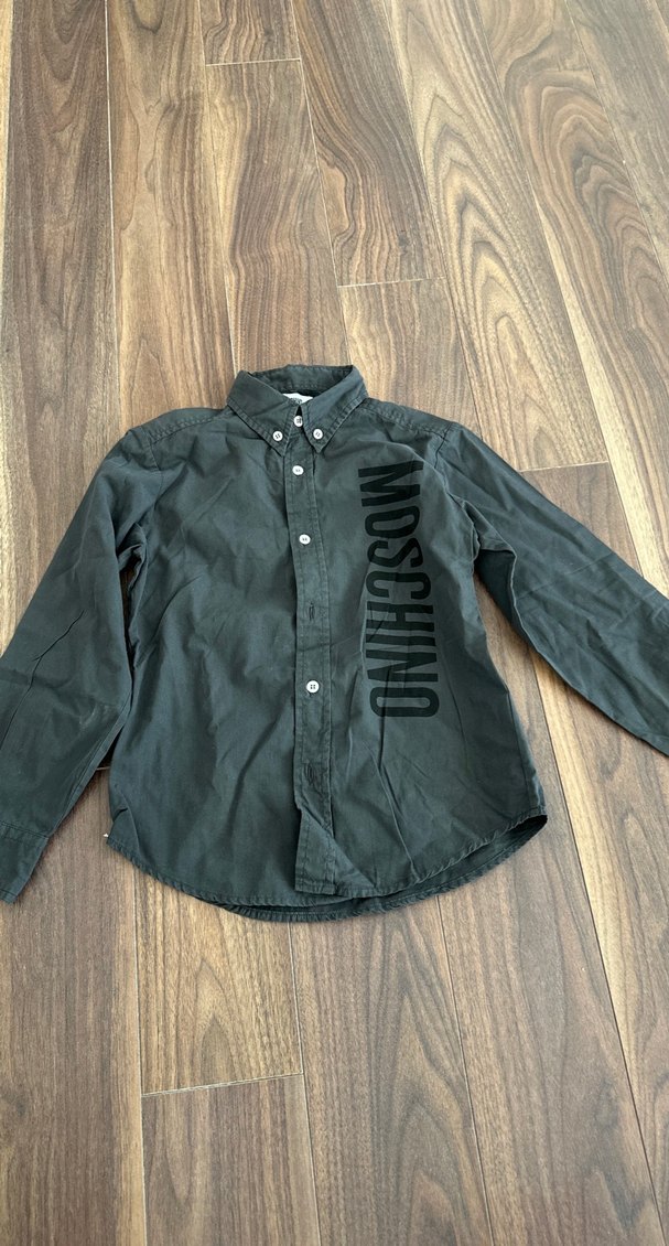 Gri renkli Moschino erkek çocuk keten gömlek, uzun kollu ve düğmeli. Notlu yaka ve bol kesim, baskılı detaylarla sokak modasına uygun.