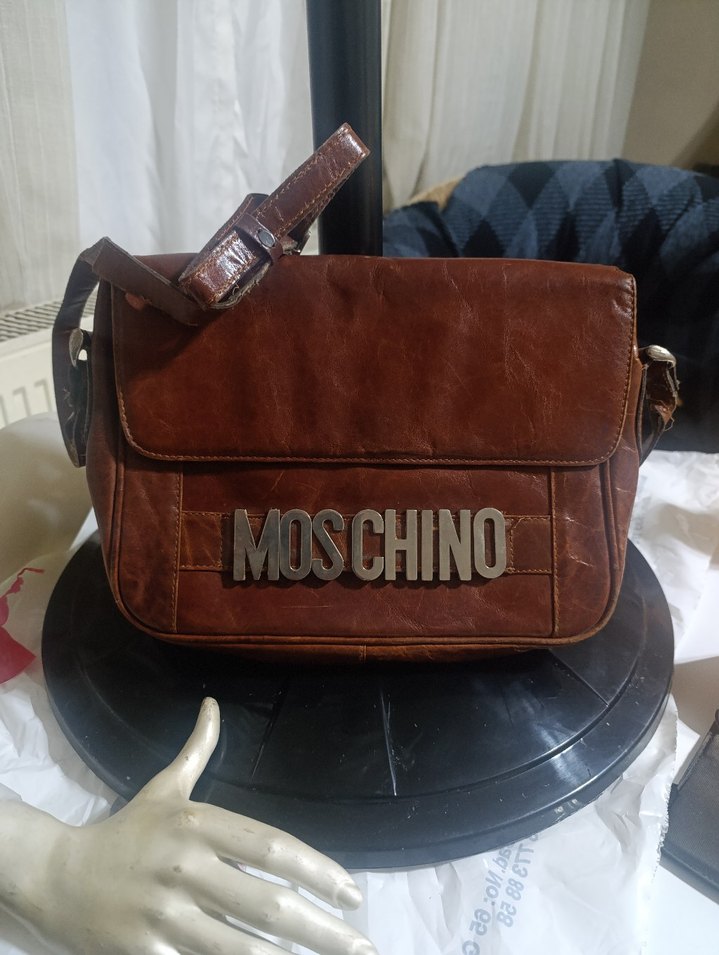 Moschino'nun parlak kahverengi deri çantası, tokalı askısı ve baskılı vintage esintili bisikletçi tarzıyla günlük kullanım için uygundur.
