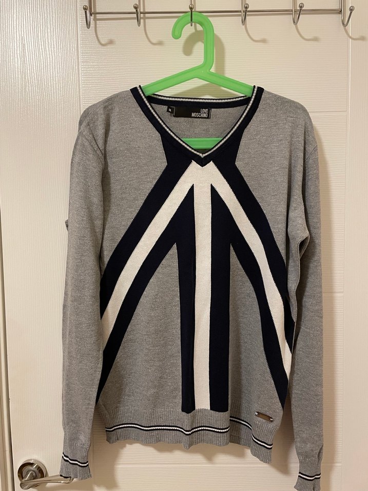 V yaka ve uzun kollu, örgü kumaştan yapılmış gri erkek kazak. Geometrik desenli, rahat kesim, günlük kullanıma uygun
