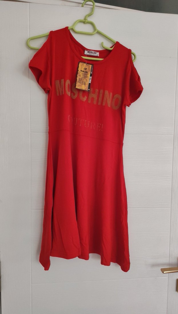 Moschino marka kırmızı elbise, kısa kollu, bisiklet yaka ve bol kesimdir. Sentetik kumaştan, drapeli ve renkli sokak stili ile athleisure tarzını birleştirir. Açık hava için uygundur.