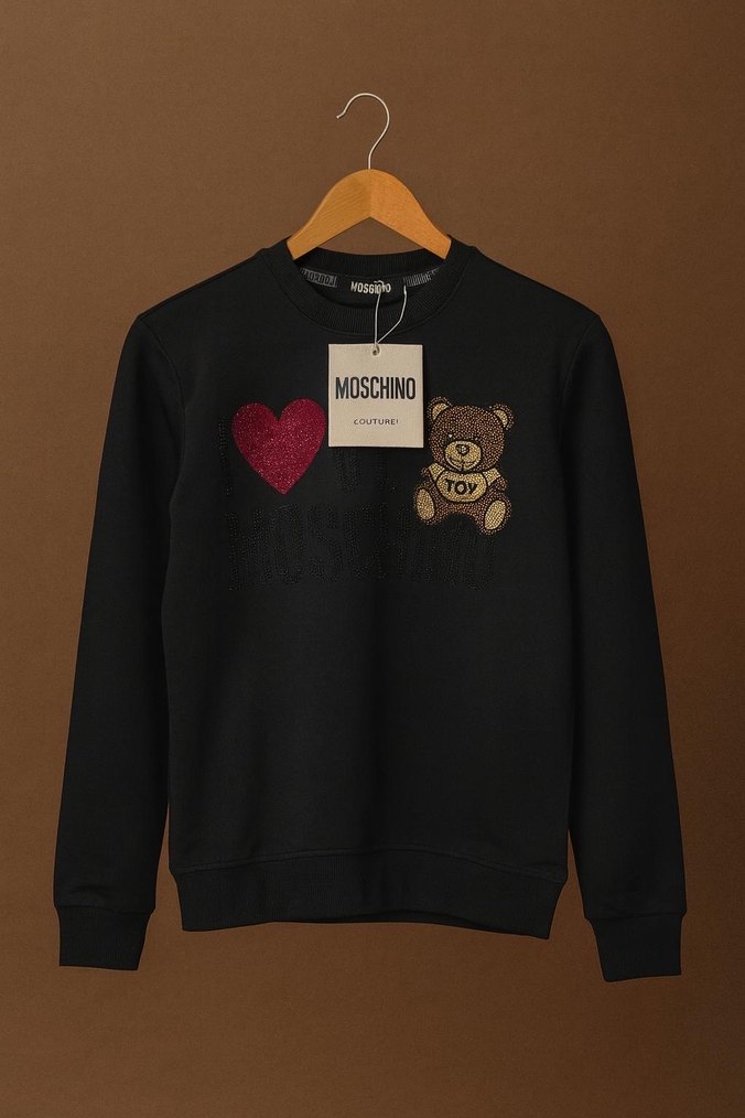 Moschino siyah sweatshirt, uzun kollu, yuvarlak yakalı ve bol kesimdir. Kabarık dokusu, kırmızı kalp ve oyuncak ayı desenleriyle yumuşak kumaştan üretilmiştir.