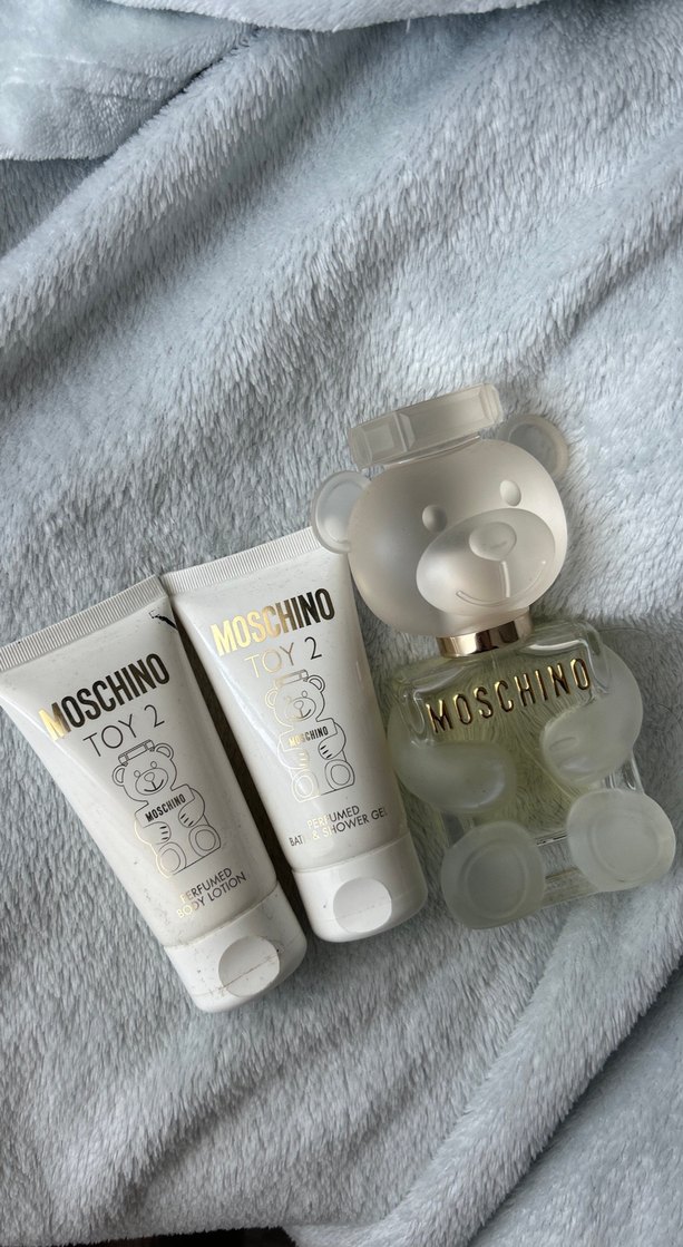Moschino Toy 2 kadın parfüm seti, ayıcık şeklinde şişe ile parfümlü vücut losyonu ve duş jeli içerir. Parfum gordugunuz gibi azcık kullanıldı dakat dus jeli ve losyon hic kullanılmadı