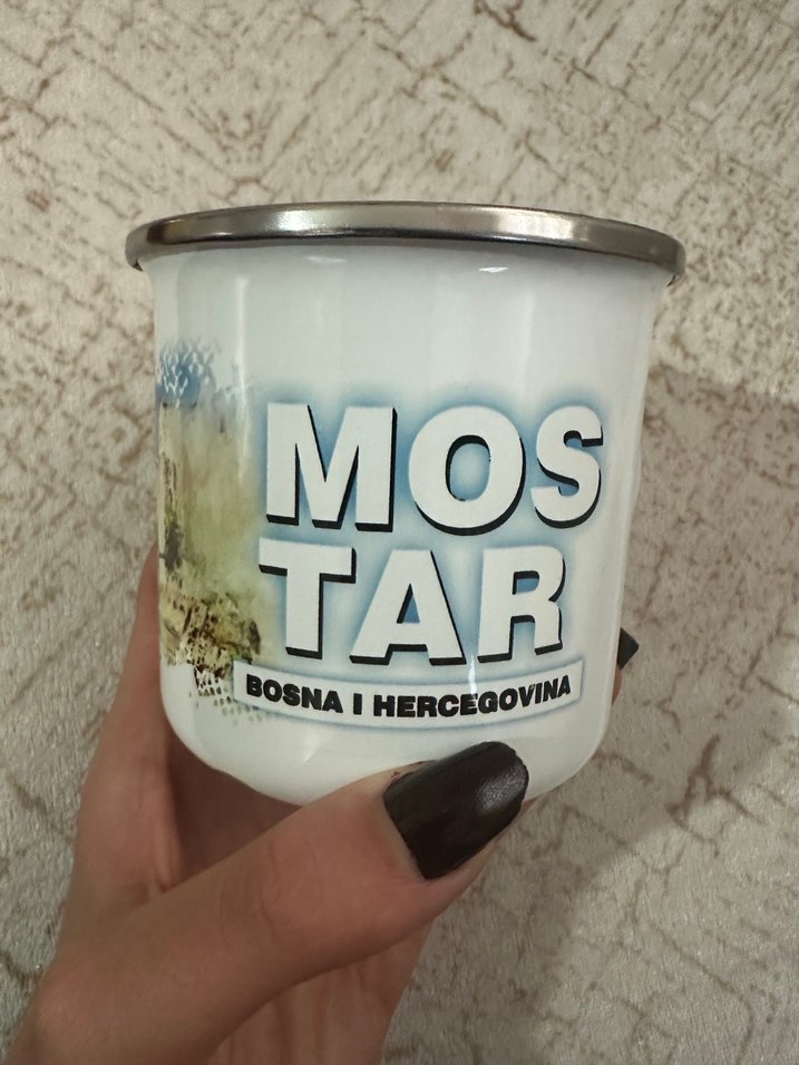 Metal kenarlı beyaz emaye kupa üzerinde 'MOSTAR' ve 'BOSNA I HERCEGOVINA' yazıları bulunur. Gri tonlarda hafif desenlidir. ☕ altında ve içinde çok küçük bir aşınma var görsellerde belirttim.