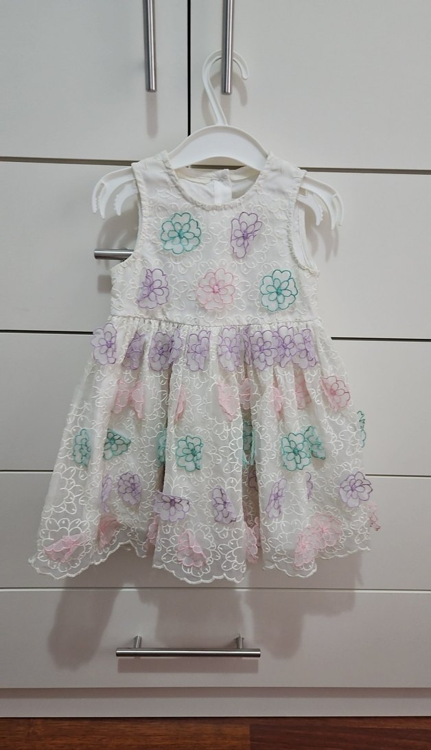 Askısız, çiçek nakışlı dantelli kız elbisesi, bol kesim ve pastel çok renkli tasarımla,astarlı