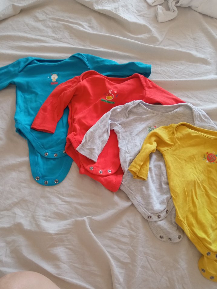 Yumuşak pamuktan, renkli nakış detaylı, düğmeli ve bisiklet yaka uzun kollu bebek body'leri. Günlük rahatlık için uygundur. Ufak lekeler olabilir ama çok belli değildir.
