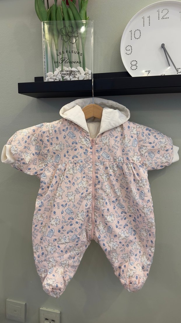 Mother Care markalı toz pembe renkli, pastel desenli bebek kız tulumu. İnce astronot. Bahar ayları için çok uygun. Kapüşonlu ve ön fermuarlıdır. ❄️