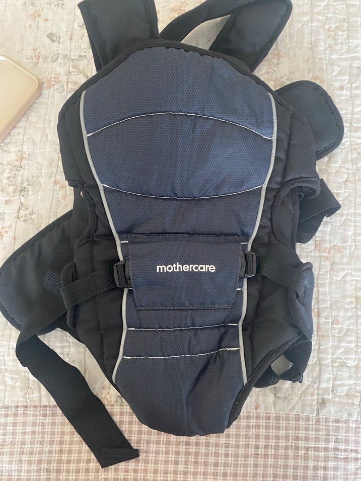 Mothercare marka koyu gri bebek taşıyıcı, yastıklı askılar ve nefes alabilir kumaşla rahat taşıma sağlar. Ayarlanabilir ve güvenli oturur.