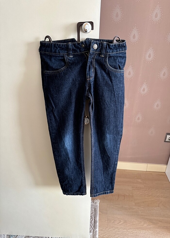 Erkek çocuk koyu lacivert kot pantolon. İçten beli ayarlanabilir lastikli. Arka cep kenarında küçük bir delik vardır. Kullanıma engel değildir