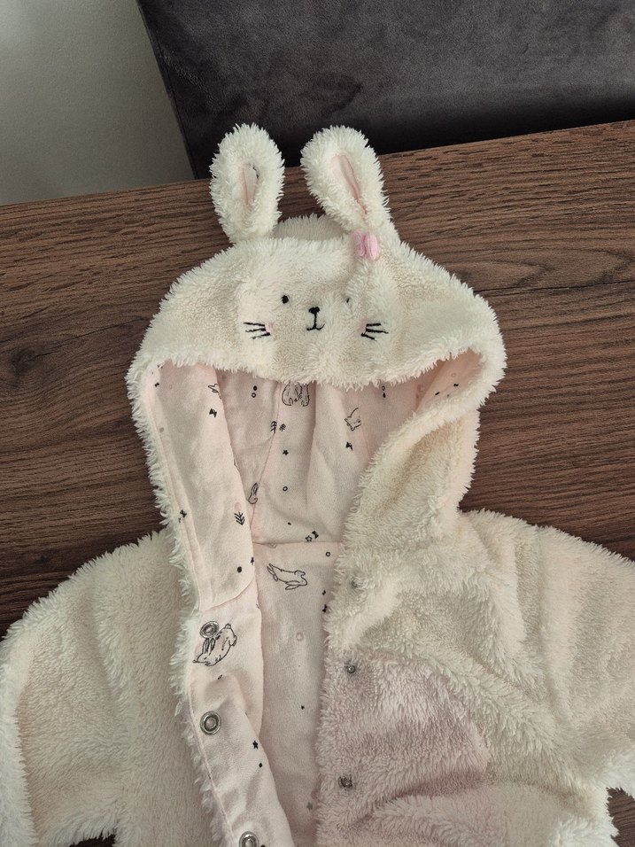 1,5-2 yaş.kullanilmadi.Magaza satış fiyati 3500 liradir.beyaz renkli, kapüşonlu ve peluş detaylı bebek tulumu.