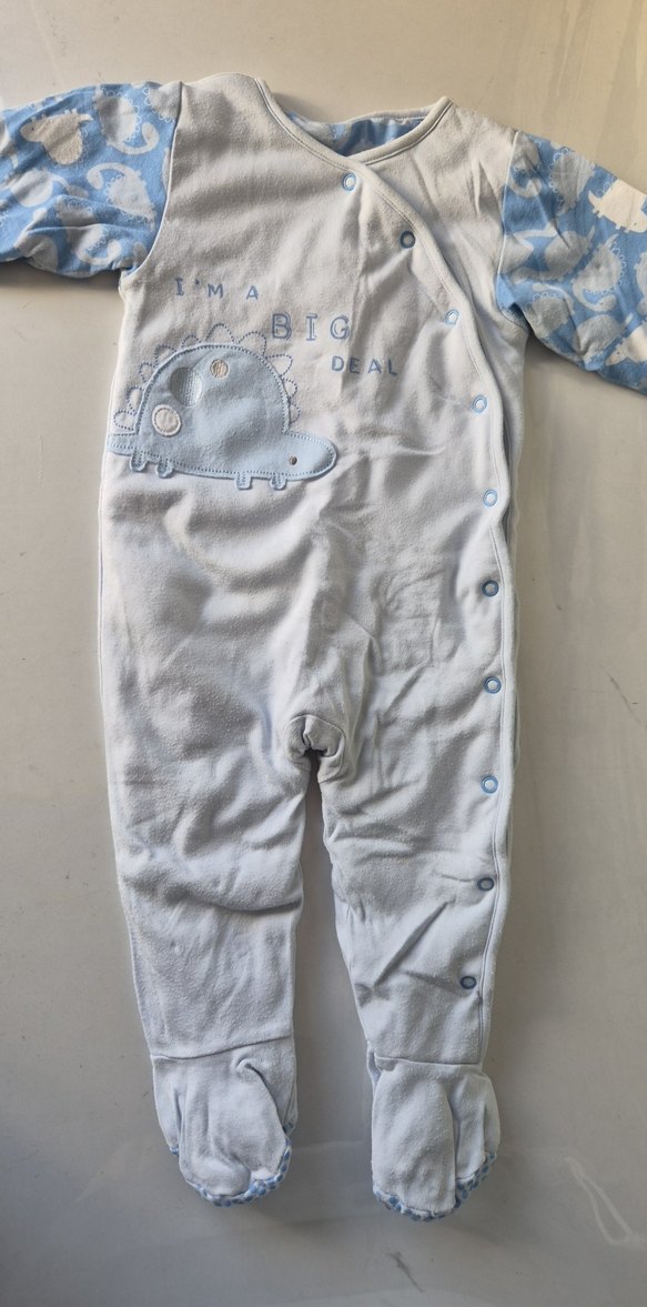 Pastel mavi renkli, uzun kollu ve düğmeli bebek tulumu. Yumuşak ve sıcak kumaştan, üzerinde "I'm a big deal" yazılı basit dinozor desenli.9-12 ay beden.Kalın güzel temiz kullanılmış bir ürün.