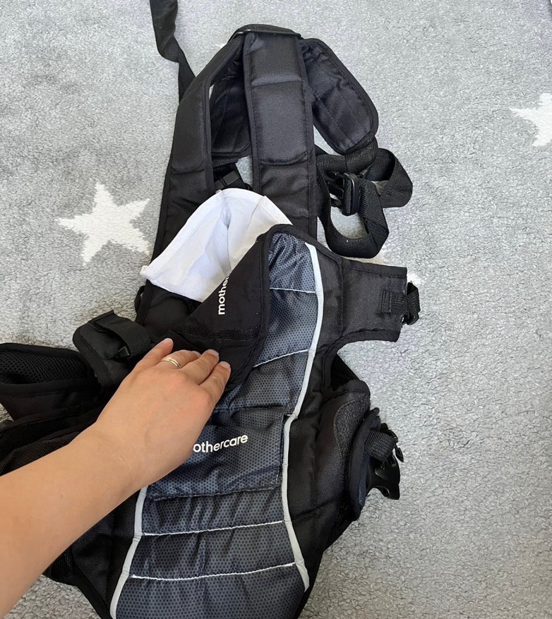 Mothercare siyah ve gri bebek taşıma aparatı, rahat taşıma için dolgulu askılar ve nefes alan kumaş içerir. Ayarlanabilir tokalarla güvenli kullanım sağlar.