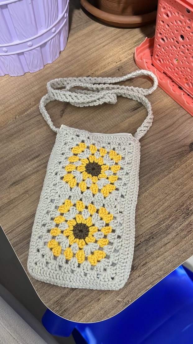 örgü çapraz çanta, sarı çiçek nakışlı detaylarla bohem tarzı yansıtıyor. Uzun askısı ile kolay taşınır.