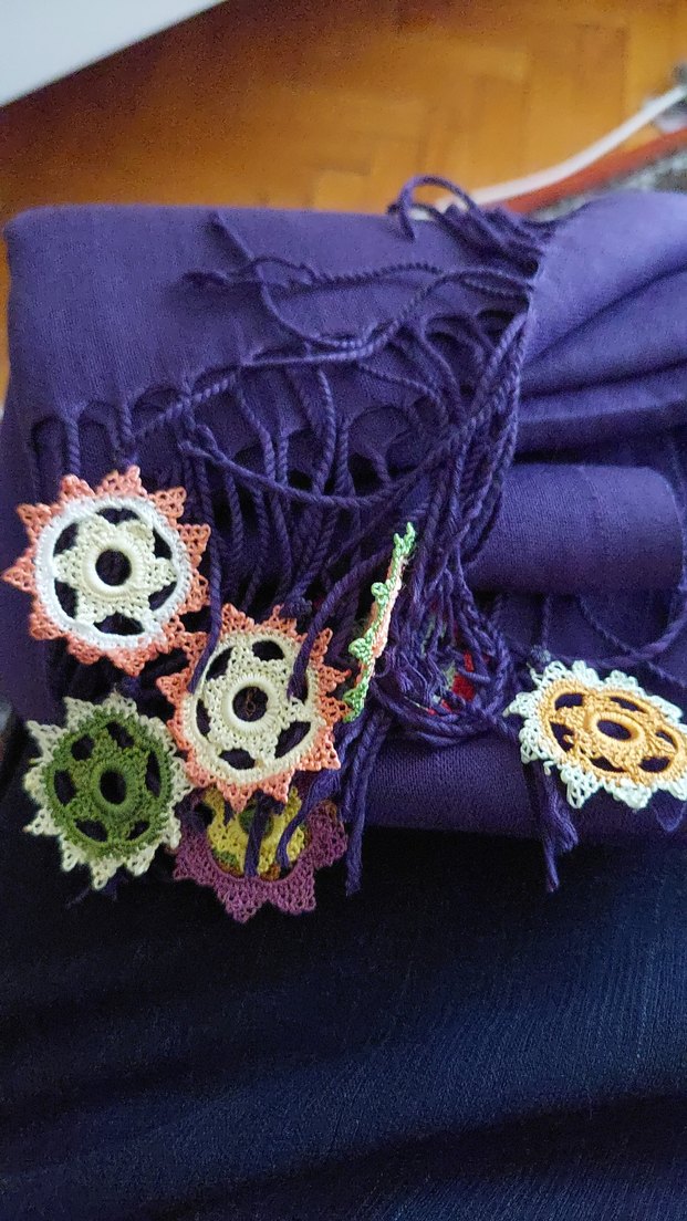 Siyah pashmina kumas kumaş üzerine renkli motifli tığ işi kenar detaylarıyla bohem tarzda kadın şalı. 4 mevsim kullanilir.Adet fiyati 650 tl