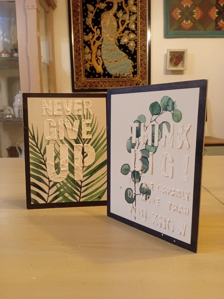 İki sanat panosu, kapaklarında motivasyonel sözler ve bitki desenleri bulunuyor. Biri "Never Give Up", diğeri "Think Big!" yazılıdır. 20x15 cm