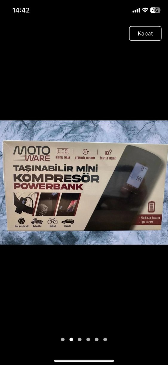 Moto Ware taşınabilir mini kompresör powerbank, LCD ekran, otomatik durdurma ve 2000 mAh batarya ile Type-C portu içerir. Araba, motosiklet, bisiklet ve top için uygundur. ⚡