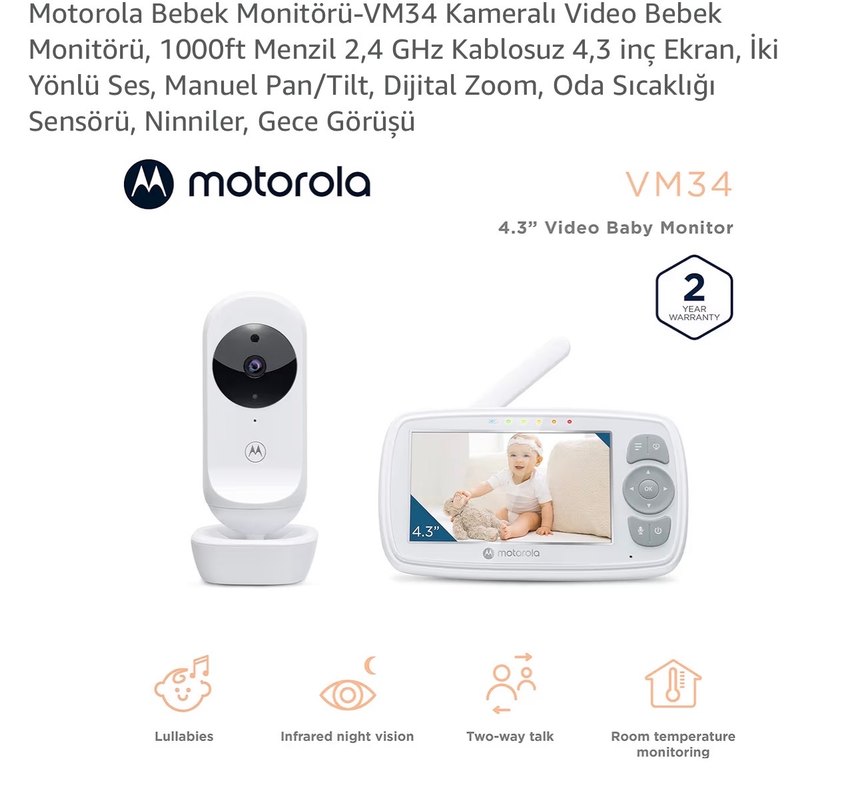 Motorola bebek monitörü, 4.3 inç ekran, kızılötesi gece görüşü, çift yönlü konuşma, manuel pan/tilt, dijital zoom ve oda sıcaklığı takibi özelliklerine sahiptir. 1000ft kablosuz menzili ve ninniler içerir. Kutulu ürün hiçbir sıkıntısı yok Yedek anneannesinde duran üründü Çocuğum büyüdüğü için satıyorum