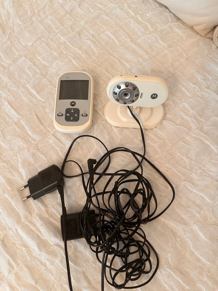 Motorola bebek monitörü ve kamera seti, gece görüş LED'li beyaz kamera ve ekranlı gri el monitörü içerir. Güç adaptörleri ve kablolarıyla birlikte gelir.