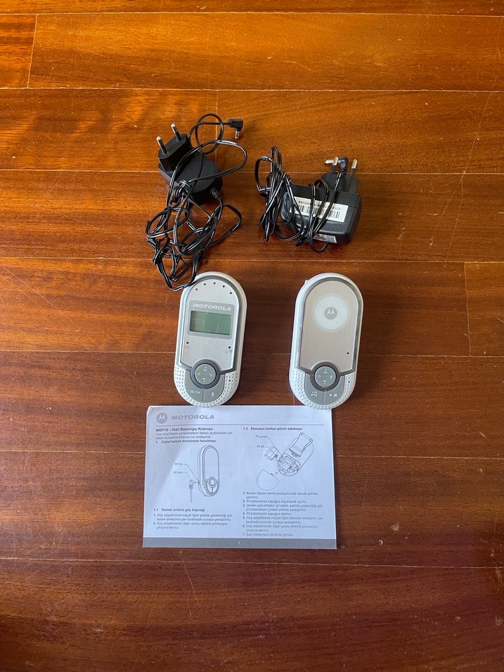 Motorola bebek telsizi seti,adaptör ve kullanım kılavuzu içerir.