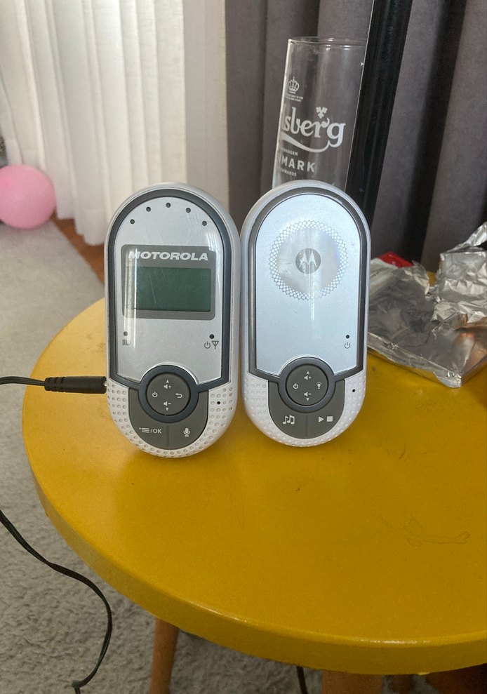 Motorola bebek telsizi ve kamera seti, ekran ve kontrol düğmelerine sahip gri-beyaz renkte. Net ses ve uzaktan izleme özellikleri bulunur. 'HARK' yazısı mevcuttur.