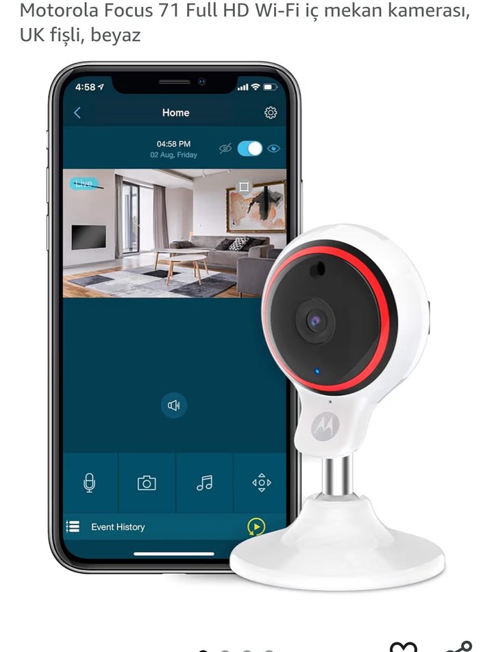 Motorola Focus 71, beyaz renkli, Full HD çözünürlüklü ve Wi-Fi bağlantılı iç mekan kamerasıdır. Olay geçmişi özelliği ve UK fişi bulunur.