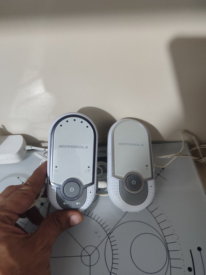 Motorola marka gri renkli bebek telsizi seti, ses kontrolü ve güç düğmesi ile net ses takibi sağlar.