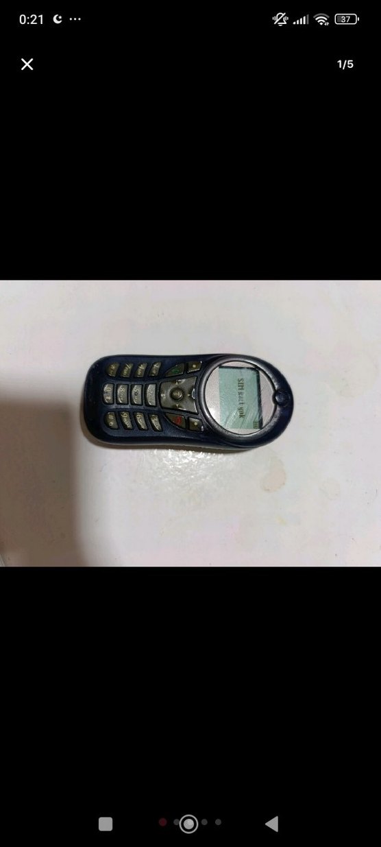 Küçük, koyu mavi renkli, eski model telefon. Yuvarlak ekranı ve fiziksel tuş takımı bulunur. Çalışıyor sorunu yok